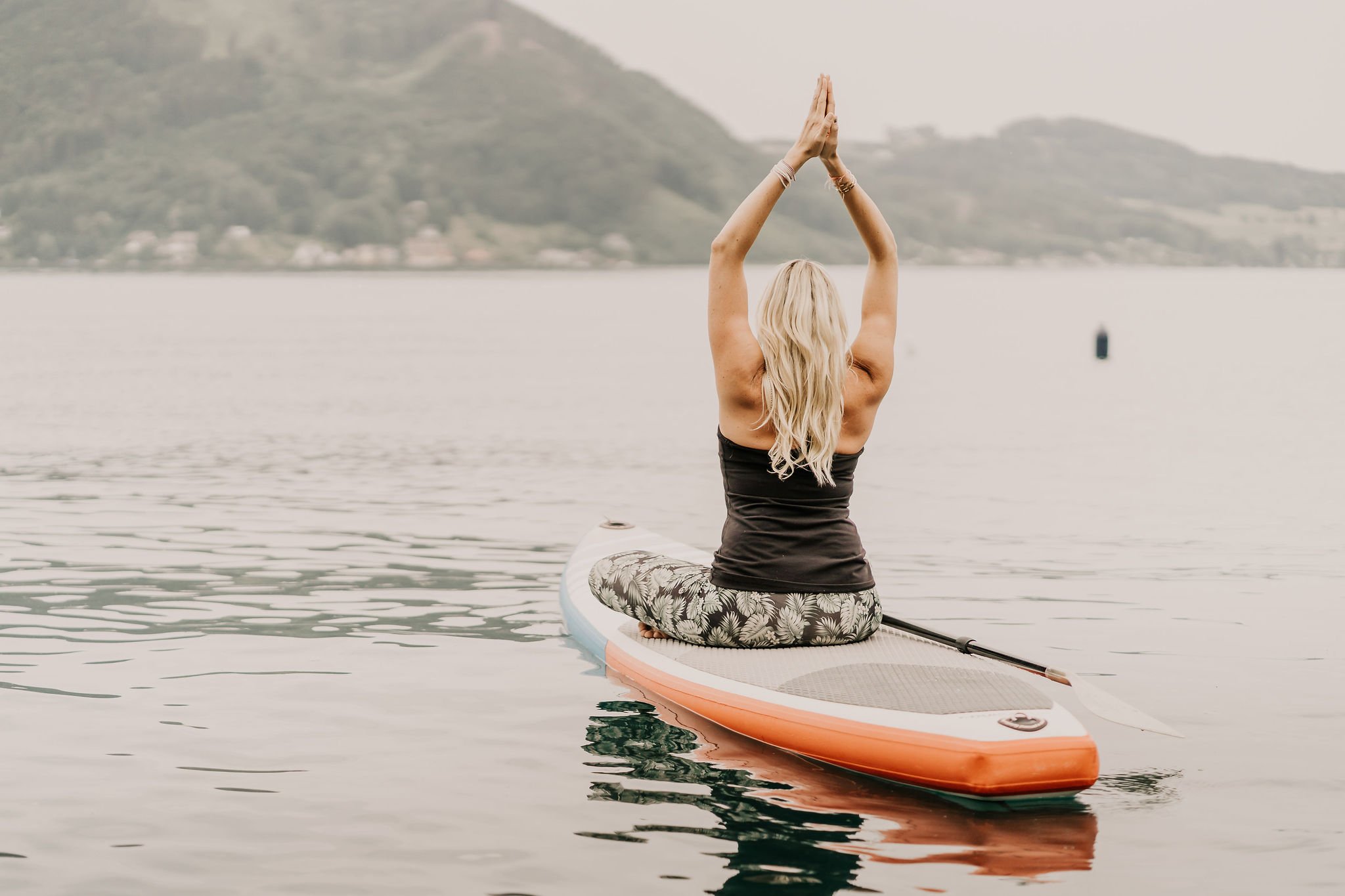 Wir paddeln hinaus in die Stille und üben Yoga mitten am See – getragen vom Wasser, umgeben von Natur und Weitblick.
